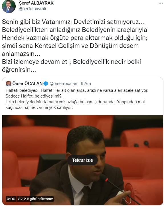 Cumhurbaşkanı Recep Tayyip Erdoğan’ın İstanbul Büyükşehir Belediye Başkanı olduğu dönemde ortaya koyduğu ‘hizmet belediyeciliği’ni devam ettiren AK Parti Halfeti Belediyesi ve Şanlıurfa Belediyesi’nin hizmetleri PKK terör örgütü lideri Abdullah Öcalan’ın yeğenini rahatsız etti. Sosyal medya hesabından Halfeti ve Şanlıurfa Belediyeleri ile ilgili çirkin iftiralarda bulunan Ömer Öcalan, “Halfeti belediyesi, Halfetililer ait olan arsa, arazi ne varsa alen acele satıyor. Sadece Halfeti belediyesi mi? Urfa belediyelerinin tamamı yolsuzluğa bulaşmış durumda. Yangından mal kaçırıcasına, ne var ne yok satılıyor” ifadelerini kullandı.