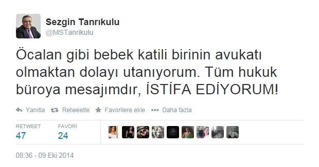 “Öcalan gibi bebek katili birinin avukatı olmaktan dolayı utanıyorum.” ifadelerinin kullanıldığı mesajda Tanrıkulu, CHP’den istifa ettiğini duyurdu.