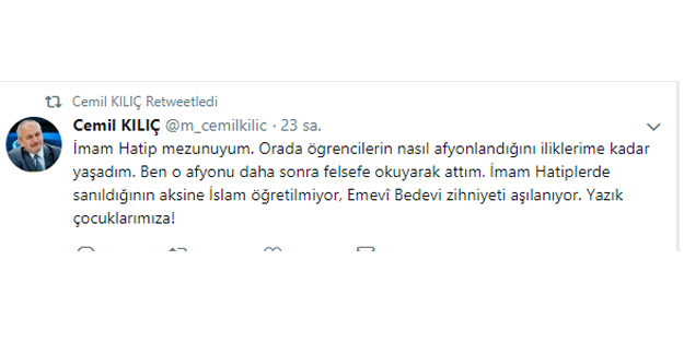 "İmam Hatip mezunuyum. Orada ögrencilerin nasıl afyonlandığını iliklerime kadar yaşadım. Ben o afyonu daha sonra felsefe okuyarak attım. İmam Hatiplerde sanıldığının aksine İslam öğretilmiyor, Emevî Bedevi zihniyeti aşılanıyor. Yazık çocuklarımıza!"