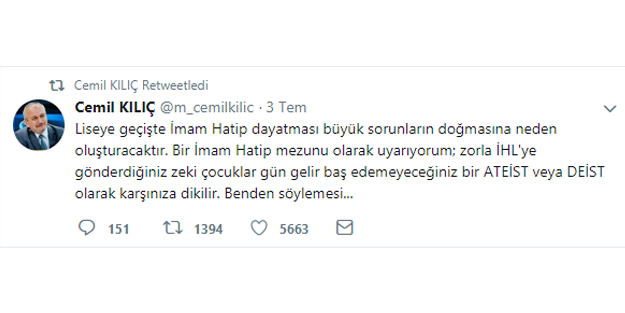 "Liseye geçişte İmam Hatip dayatması büyük sorunların doğmasına neden oluşturacaktır. Bir İmam Hatip mezunu olarak uyarıyorum; zorla İHL'ye gönderdiğiniz zeki çocuklar gün gelir baş edemeyeceğiniz bir ATEİST veya DEİST olarak karşınıza dikilir. Benden söylemesi..."