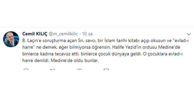"B. Laçin'e soruşturma açan Sn. savcı, bir İslam tarihi kitabı açıp okusun ve "evlad-ı harre" ne demek, eğer bilmiyorsa öğrensin. Halife Yezid'in ordusu Medine'de binlerce kadına tecavüz etti, binlerce çocuk dünyaya geldi. O çocuklara evlad-ı harre denildi. Medine'de oldu bunlar."