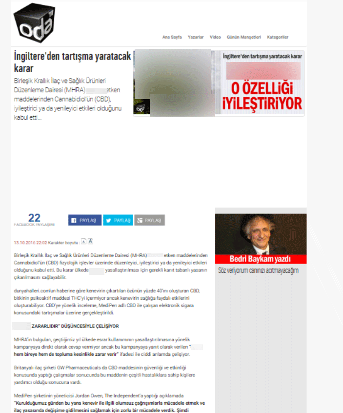 Haberin girişteki spotunda “Birleşik Krallık İlaç ve Sağlık Ürünleri Düzenleme Dairesi (MHRA) …..’ın etken maddelerinden Cannabidiol‘ün (CBD), iyileştirici ya da yenileyici etkileri olduğunu kabul etti...” ifadelerine yer veriyor. Yine haberin detayında “Bu karar ülkede …..’ın yasallaştırılması için gerekli kanıt tabanlı yasanın çıkarılmasını sağlayabilir” diye vurgulanıyor. Aynı şekilde ara başlıklardaki detaylar da dikkatlerden kaçmıyor. Ara başlıkta ise şu ifadelere yer veriliyor: “….. zararlıdır” düşüncesiyle çelişiyor”…