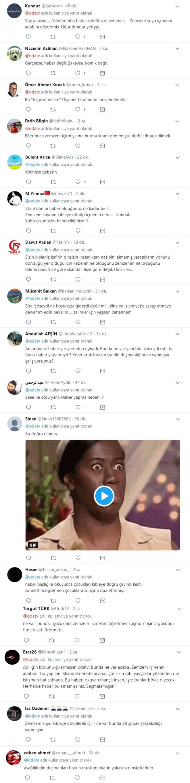 Gaziantep Şehitkamil Gönüllü Hizmet Vakfı İnal Aydınoğlu İlkokulu’nda görevli öğretmen Arif Özbek'in öğrencilerini kıbleye dönerek zemzem içirmesi, toplumun dini değerlerinden bihaber olan ve bu değerleri sürekli aşağılayan OdaTV'nin hedefi oldu.