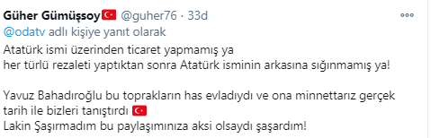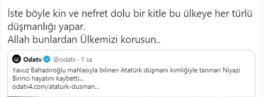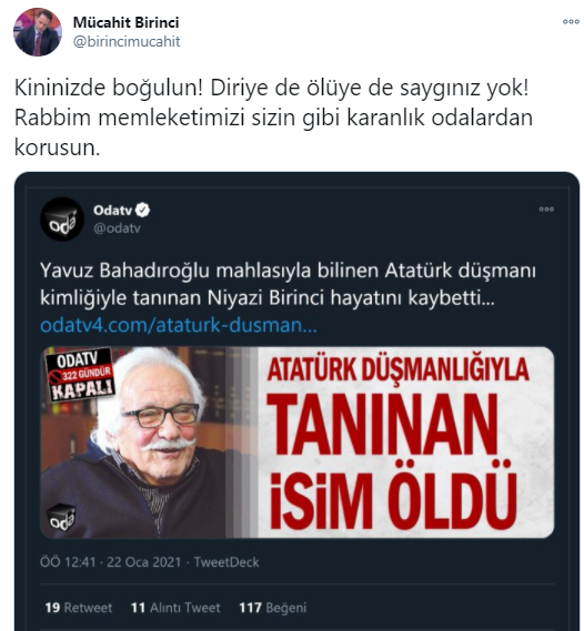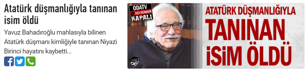 Odatv Yavuz Bahadıroğlu için ‘Atatürk düşmanlığıyla tanınan isim öldü’ manşetini atarken, haberde, “Yavuz Bahadıroğlu mahlasıyla bilinen Atatürk düşmanı kimliğiyle tanınan Niyazi Birinci hayatını kaybetti...” ifadelerine yer verdi.