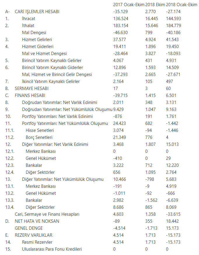 Türkiye Cumhuriyet Merkez Bankası (TCMB) tarafından Ekim 2018 dönemine ilişkin ödemeler dengesi verileri açıklandı.