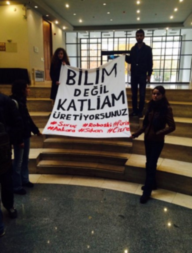 ODTÜ'de bazı öğrenciler savunma sanayii alanında yapılan üretimleri, açtıkları pankartla protesto etti.