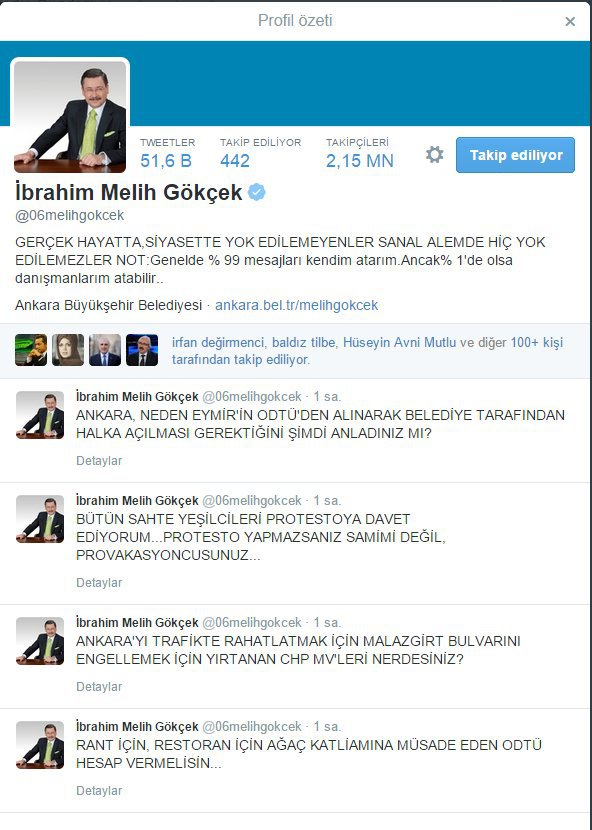 ODTÜ tarafından Eymir Gölü çevresinde yapılan ağaç katliamını Ankara Büyükşehir Belediyesi Başkanı Melih Gökçek'in sosyal medyadan duyurdu. Kesilen ağaçların fotoğraflarını paylaşan Gökçek, çevreci ODTÜ'lüleri protestoya çağırdı.
