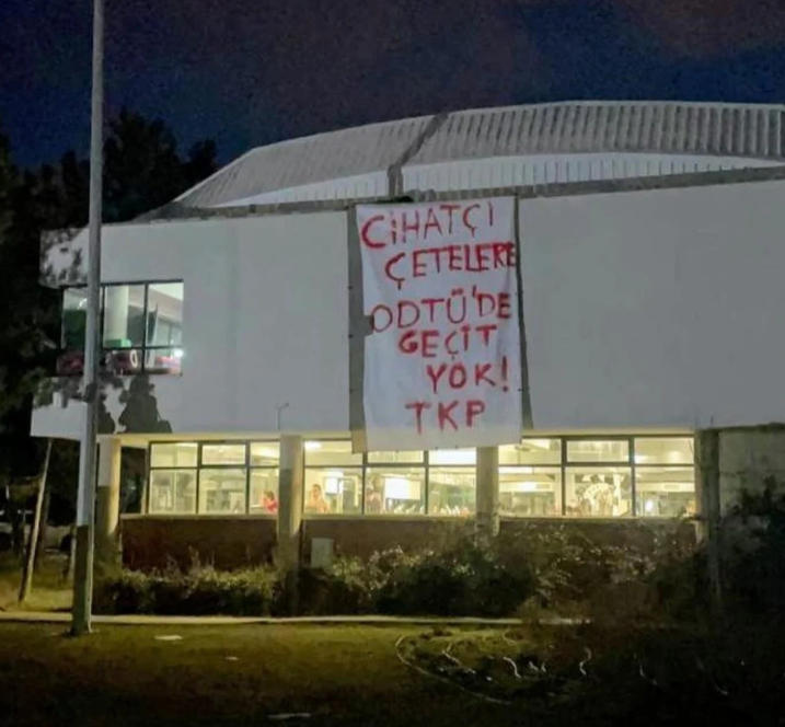 ODTÜ'de iftar yapıp teravih kılan öğrencileri hedef alan TKP'li grup, "Cihatçı çetelere ODTÜ’de geçit yok." pankartı astı.