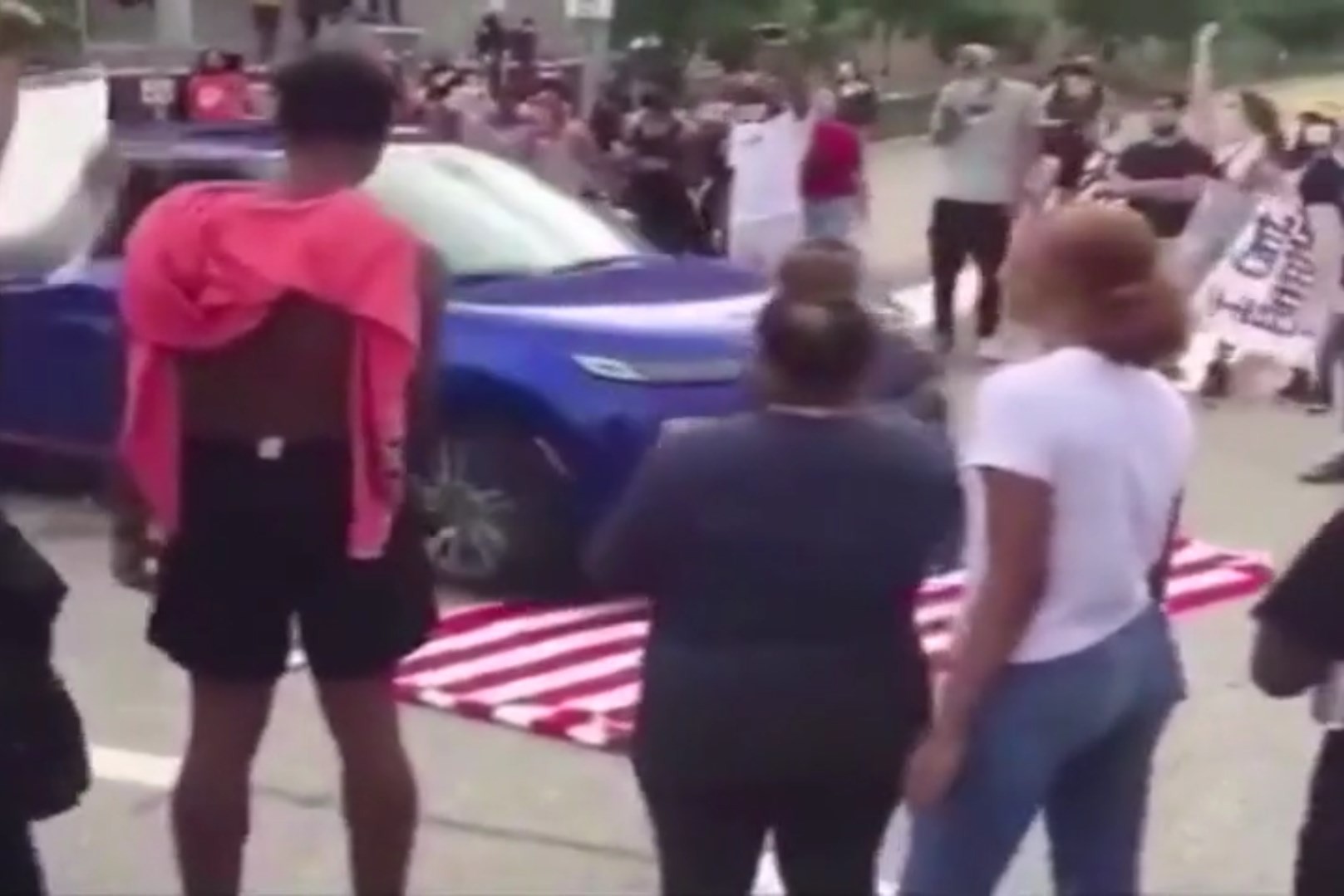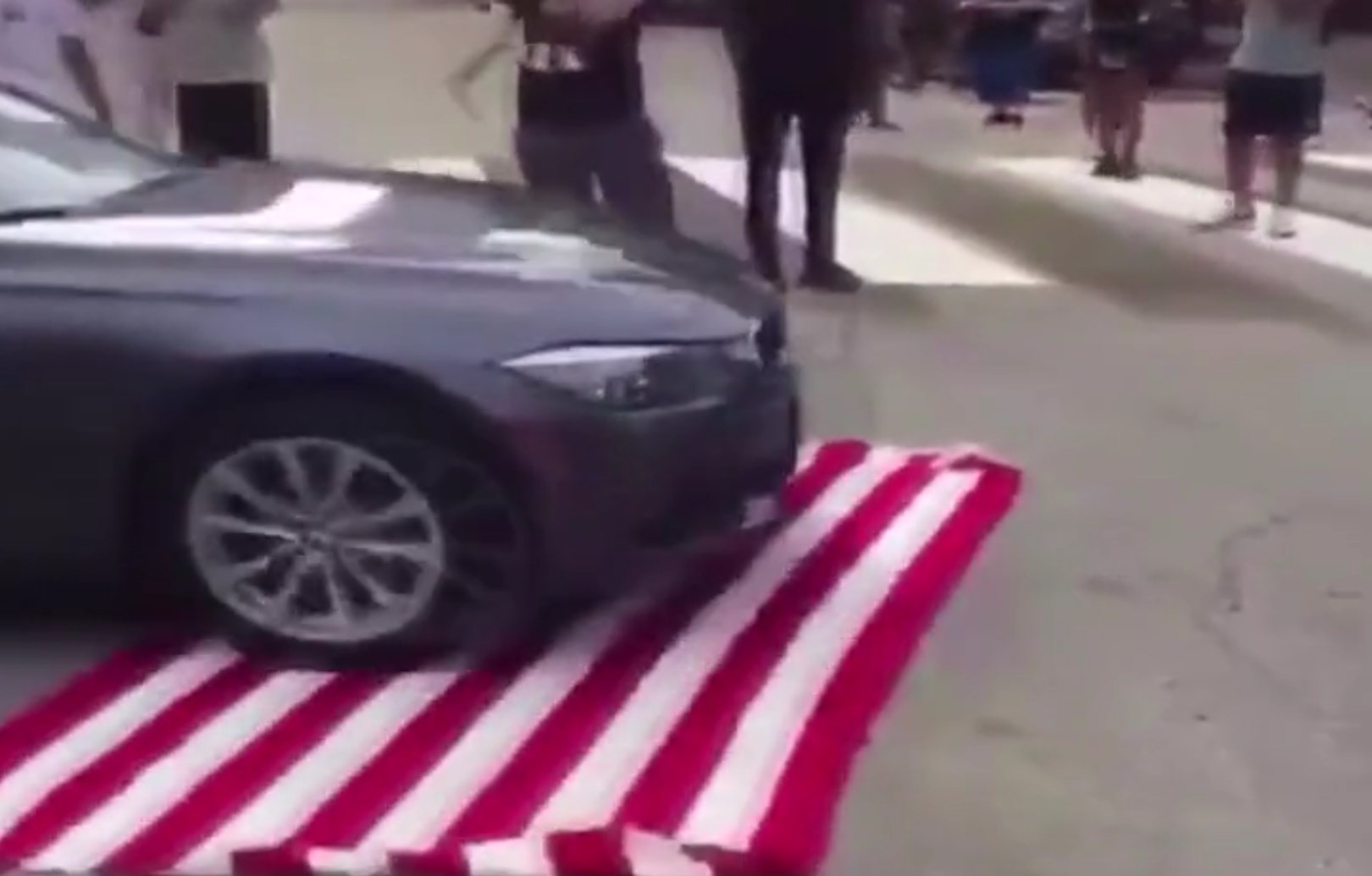 Trump'ın tavrı nedeniyle hareketlenen bir grup eylemci, yolun ortasına serdikleri ABD bayrağını araçlarıyla üstünden geçip ezerek sevinç nidaları attı.