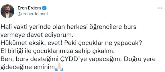 Erdem paylaşımında, “Hali vakti yerinde olan herkesi öğrencilere burs vermeye davet ediyorum. Hükümet eksik, evet! Peki, çocuklar ne yapacak? El birliği ile çocuklarımıza sahip çıkalım. Ben, burs desteğimi ÇYDD’ye yapacağım. Doğru yere gideceğine eminim” ifadelerini kullandı.