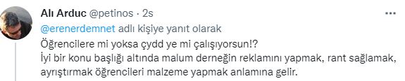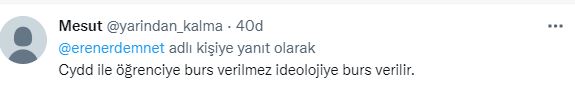 Erdem’in paylaşımının altına yorum yapan bazı sosyal medya kullanıcıları ise, “Öğrencilere mi yoksa ÇYDD’ye mi çalışıyorsun? İyi bir konu başlığı altında malum derneğin reklamını yapmak, rant sağlamak, ayrıştırmak öğrencileri malzeme yapmak anlamına gelir” , “ÇYDD ile öğrenciye burs verilmez ideolojiye burs verilir” şeklinde tepki gösterdiler.