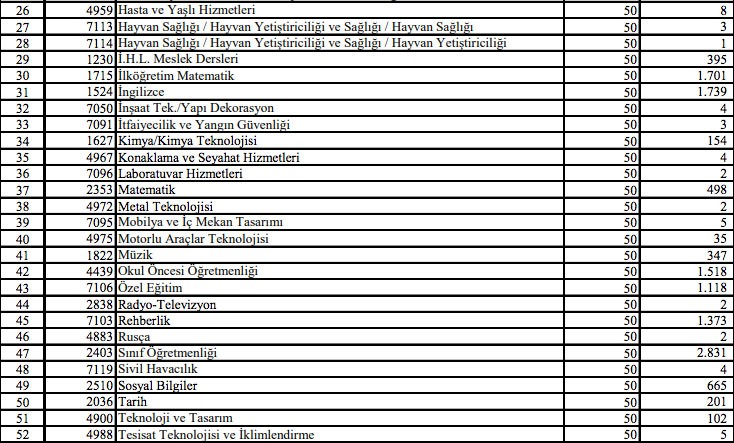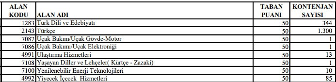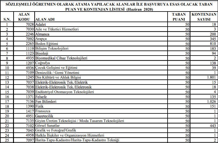 Sözleşmeli öğretmen ataması alanları, öğretmen ataması taban puanları ve kontenjanları listesi (2020 Haziran)