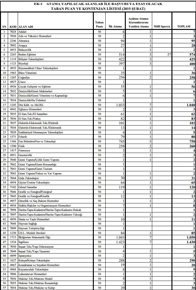 15 bin öğretmen kadrosuna atama yapılacak alanlar ile başvuruya esas olacak taban puan ve kontenjan listesi açıklandı.