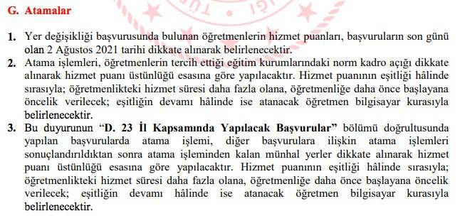Öğretmen atamalar tercih ve hizmet puanı üstünlüğüne göre gerçekleştirilecek olup başvuru kayıt işlemi yapıldıktan sonra hizmet puanlarına etki edecek değişiklikler başvuru sistemine yansımayacağından, ilgililerin hizmet puanına etki edecek değişiklikleri yer değiştirme başvurusunu yapmadan önce tamamlamaları gerekmektedir.