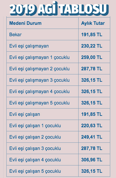 AGİ tutarı 2018 yılında 152,21 ile 258,76 lira arasındaydı. Yeni asgari ücretle birlikte AGİ 2019 yılında en düşük 191,85 TL - en yüksek tutar 326,15 TL oldu. İşte tüm çalışanların 2019 yılı AGİ ödemeleri: