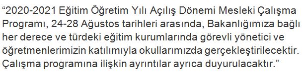 Milli Eğitim Bakanlığı çalışma takviminde okulların 31 Ağustos tarihinde yüz yüze eğitime geçileceği planlanmışken, artan koronavirüs vakaları ve Bilim Kurulu kararı ile 21 Eylül'de aşamalı ve seyreltilmiş şekilde yüz yüze eğitime geçilmesi kararı alındı. 31 Ağustos ile 21 Eylül arasında ise öğrenciler uzaktan eğitim ile derslerine devam edecek.