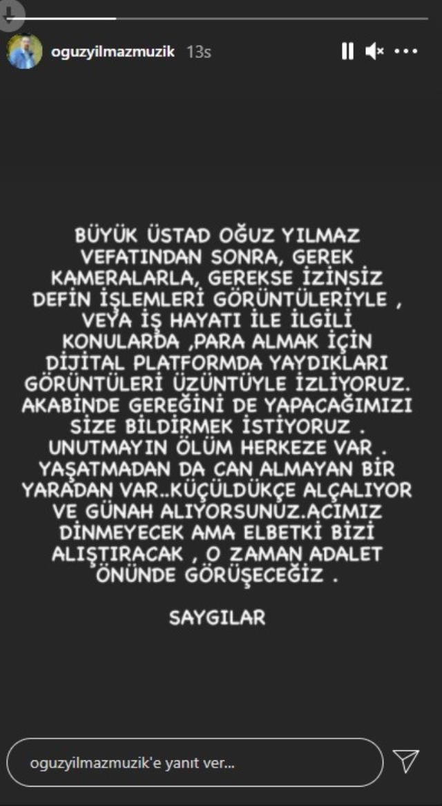 "Büyük üstat Oğuz Yılmaz'ın vefatından sonra gerek kameralarla, gerekse izinsiz defin işlemleri görüntüleriyle veya iş hayatı ile ilgili konularda para almak için dijital platformlarda yaydıkları görüntüleri üzüntüyle izliyoruz.