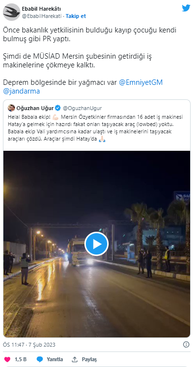 MÜSİAD tarafından bölgeye gönderilen iş makinelerini de ekibinin getirdiği yalanını söyleyen etkileşim soytarısı Oğuzhan Uğur’un yüzsüzlüğü sosyal medyada tepkiyle karşılandı