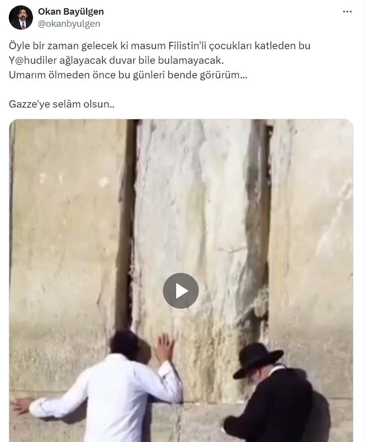 Özellikle CHP’nin konserlerle para pompaladığı sözde sanatçılar Gazze’deki soykırıma karşı lütfedip iki cümle kuramazken, sosyal medya hesabından ağlama duvarı önünde ağlayan iki Yahudinin görüntüsünü paylaşan Okan Bayülgen, “Öyle bir zaman gelecek ki masum Filistin'li çocukları katleden bu Y@hudiler ağlayacak duvar bile bulamayacak. Umarım ölmeden önce bu günleri bende görürüm... Gazze'ye selâm olsun..” diye yazdı.