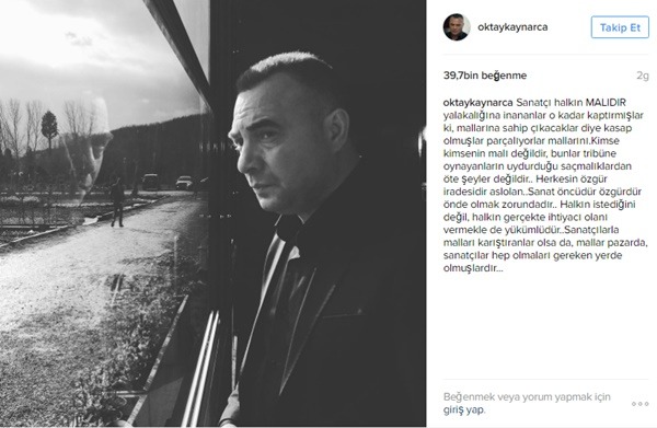 Sosyal medyadaki paylaşımlarıyla tepki alan Oktay Kaynarca, son olarak 'sanatçı' açılımıyla dikkat çekti. Sanatçıya 'halkın malıdır' diyenleri eleştiren Kaynarca, sanatın özgür olduğunu söyledi. 'Sanatçı halkın malıdır' sözü için ise "Bunlar tribüne oynayanların uydurduğu saçmalıklardan öte şeyler değildir" ifadelerini kullandı.