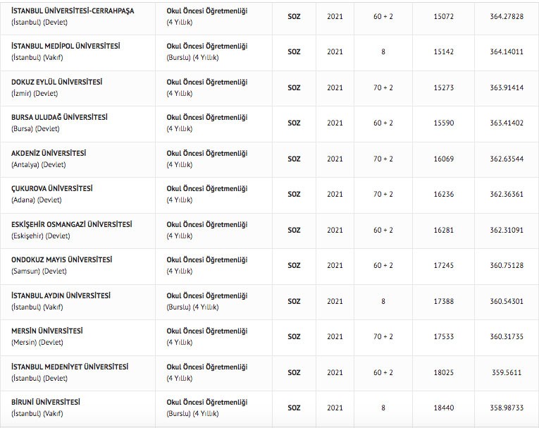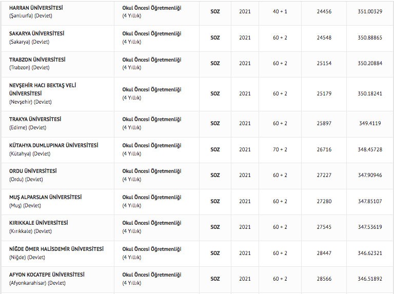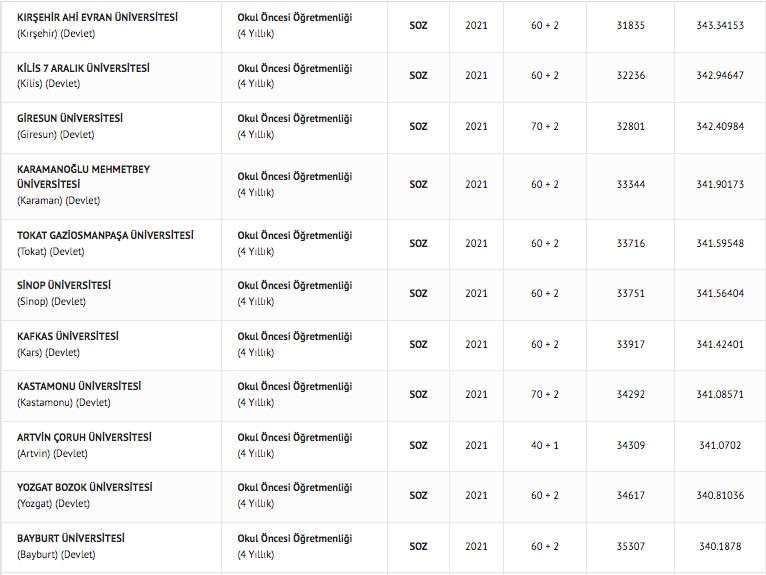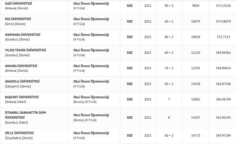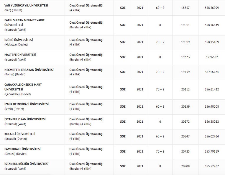 Okul Öncesi Öğretmenliği bölümü taban puanları ve başarı sıralamaları 2022: