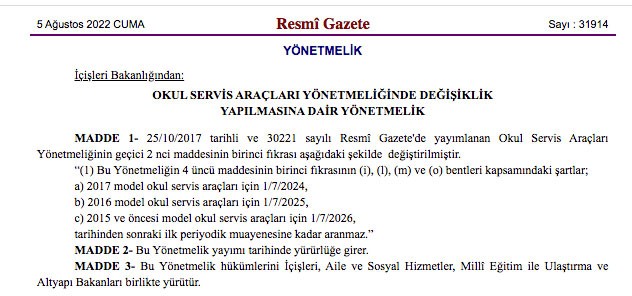 Okul servis araçları yönetmeliği son dakika haberleri servislik yapanlar tarafından merak ediliyor. Milli Eğitim Bakanlığı 2022 - 2023 eğitim öğretim takvimine göre okullar 12 Eylül’de açılacak. Okulların açılacak olması nedeniyle okul servisleri de hazırlıklarını yapıyor. Okul servislerine yönelik muayene düzenlemesine ilişkin detaylar Resmi Gazete’de yayımlandı. İşte kul servisleri düzenlemesine ilişkin son değişiklikler.