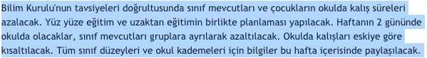 Okullarda cumartesi günü ders var mı? Kabine toplantısı sonrası açıklanan kararlardan biri de köy okulları. Köy okulları da yüz yüze eğitime başlayacak. Köy okullarından da velinin rızası aranacak. Yüz yüze eğitim için okula gelmeyen öğrenciler sınavlardan müfredattan sorumlu olacak. Uygun görmesi durumunda cumartesi günleri de okullarda ders işlenebilecek.