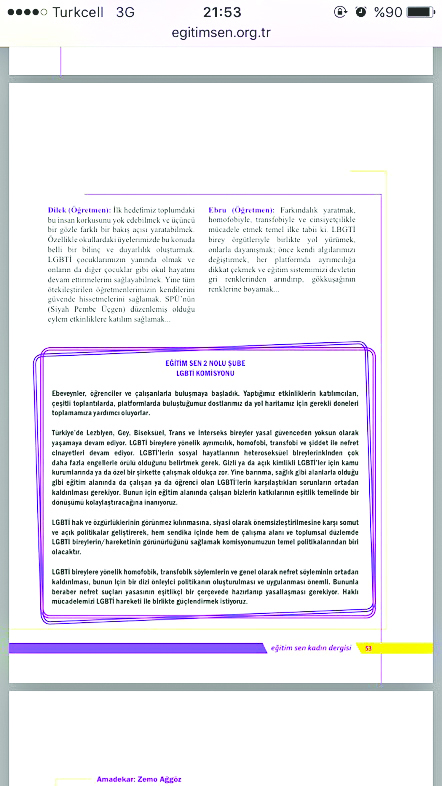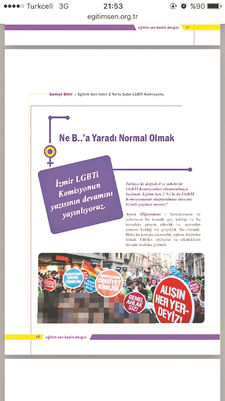 YUSUF ZİYA GENÇ / ANKARA - Münferit bir tecavüz olayı üzerinden bütün İslami oluşumları suçlayarak hedef alan marjinal sol öğretmenler sendikası Eğitim Sen, LGBTİ’liler (Lezbiyen, Gay, Biseksüel, Transgender ve İnterseks) ile ortak hareket etmek için ittifak kurdu. Toplumun ahlaki değerlerini hedef alan Eğitim Sen’in bütün şubelerinde LGBTİ komisyonu kurulma kararı alınırken, bu karar öğrenci velilerini tedirgin etti. Ahlaksız ortaklık, Eğitim Sen Kadın Dergisi ve KAOS-GL’den ilan edilirken, akla ziyan teklifler de dile getirildi! Çalışmalar kapsamında okullara ve iş yerlerine gay ve lezbiyenliği tanıtıcı afişler asılmasına karar verildi.
