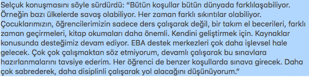 Bakan Selçuk, şunları kaydetti: Salgın düşüş eğiliminde ancak yeterli değil. Bunların hepsini her şekilde değişikliği dikkate alacak şekilde düşünüyoruz. 4 Ocak iyimser bir tahmin, esnek bir yapı ile ilerliyoruz. Salgının durumu düşüşe geçince gerekeni yapacağız. Yarın okul açılsın denilirse biz her şeye hazırız. Risk varsa biz orada yokuz. Okulların açılması dikkatli olunmasına bağlı, biz hazırız. Okulların açılması benim açımdan o kadar önemli ki, velilerimiz, öğretmenlerimiz çok yoruldu. Uzaktan eğitim kat kat zordur. Farklı görüşlere sahip bilim insanlarıyla görüşmeler yaptıkça o zaman tablo daha çok netleşiyor. Ben tıp alanında uzman değilim. Her kesimin görüşünü almak zorundayız. Yaptığımız şey sadece bu.”