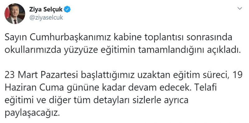“Milli Eğitim Bakanlığımıza bağlı okulların eğitim-öğretim yılını sona erdirmeyi kararlaştırdık. Yeni eğitim-öğretim yılı önümüzdeki önümüzdeki eylül ayında başlayacaktır. Bakanlığımızın yaz aylarındaki kurs ve benzeri faaliyetleriyse kendi takviminde devam edecektir. Üniversitelerle ilgili duyuruyu YÖK zaten daha önce yapmıştı. Kreşler ve gündüz bakımevleri 15 Haziran'da faaliyete geçecektir.”