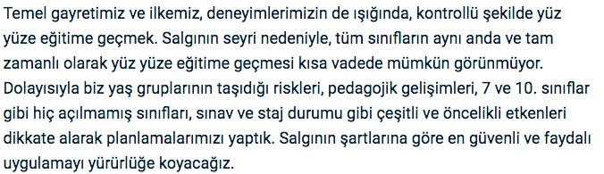 Milli Eğitim Bakanı Selçuk, salgının seyri nedeniyle, tüm sınıfların aynı anda ve tam zamanlı olarak yüz yüze eğitime geçmesinin kısa vadede mümkün görünmediğini vurgulayarak, "Salgının şartlarına göre en güvenli ve faydalı uygulamayı yürürlüğe koyacağız" dedi.