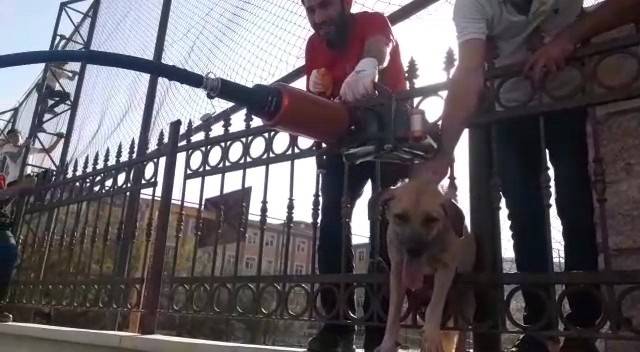 Olay yerine giden itfaiye ekipleri, demirleri keserek köpeği kurtardı. Demirler kesildikten sonra köpeğin aşağı inerken düşmemek için duvara tutunması ve ekiplerin yardımcı olması cep telefonu kamerasına yansıdı.