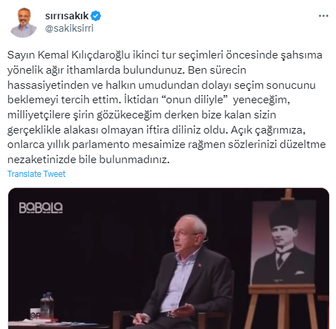 Sayın Kemal Kılıçdaroğlu ikinci tur seçimleri öncesinde şahsıma yönelik ağır ithamlarda bulundunuz. Ben sürecin hassasiyetinden ve halkın umudundan dolayı seçim sonucunu beklemeyi tercih ettim. İktidarı “onun diliyle” yeneceğim, milliyetçilere şirin gözükeceğim derken bize kalan sizin gerçeklikle alakası olmayan iftira diliniz oldu. Açık çağrımıza, onlarca yıllık parlamento mesaimize rağmen sözlerinizi düzeltme nezaketinizde bile bulunmadınız.