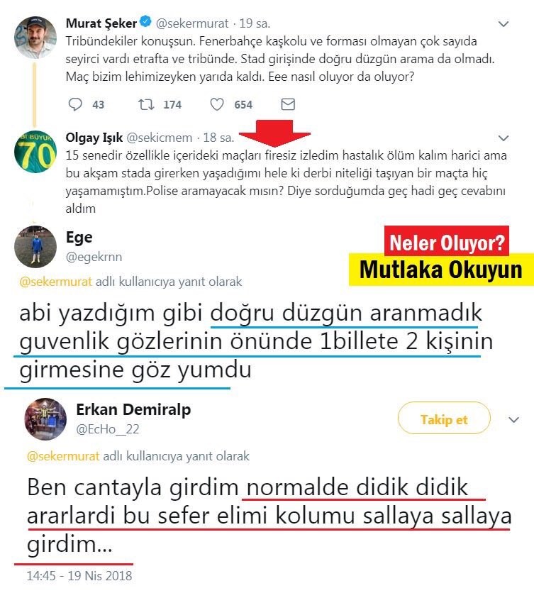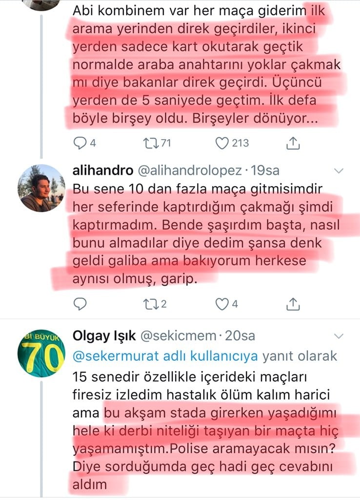 Kombinesi olan bir Fenerli taraftarı da, 'Kombinem var her maça giderim ilk arama yerinden direk geçirdiler. İkinci yerden sadece kart okutarak geçtik. Normalde araba anahtarını yoklar çakmak mı diye bakanlar direk geçirdi.' diyerek maç öncesi isyan ettiği belirlendi.