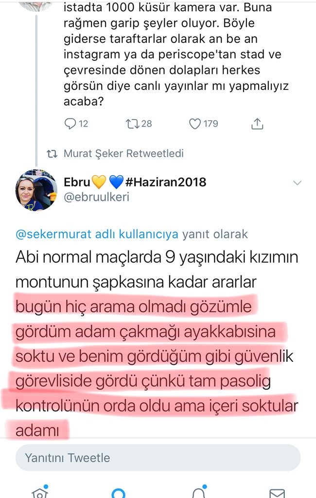 15 yıldır maçlara gittiğini belirten bir Fenerbahçe taraftarı, 'Polise aramayacak mısın? diye sorduğumda geç hadi geç cevabını aldım.' 'Osmanlı maçına gittim daha sıkı arama vardı bu maçta hakikaketen öylesine arama yapıldı.'