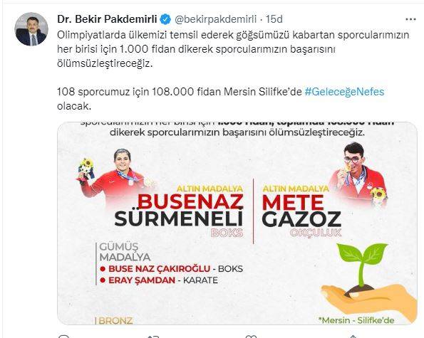 Tarım Orman Bakanı Bekir Pakdemirli sosyal medya hesabından yaptığı paylaşımla Olimpiyatlarda ülkemizi temsil ederek aldıkları madalyalarla bizleri gururlandıran, göğsümüzü kabartan sporcularımızın her biri için 1.000 fidan dikileceği müjdesini verdi.