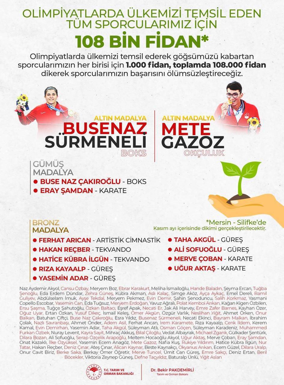 Yangınlarda kaybeden ormanlarımızı yeniden yeşertmek için harekete geçen Tarım Orman Bakanı Bekir Pakdemirli, olimpiyat oyunlarına katılan tüm oyuncular adına 108 bin fidan dikerek ormanlarda sporcularımızın adlarını yeşerterek onurlandıracak.