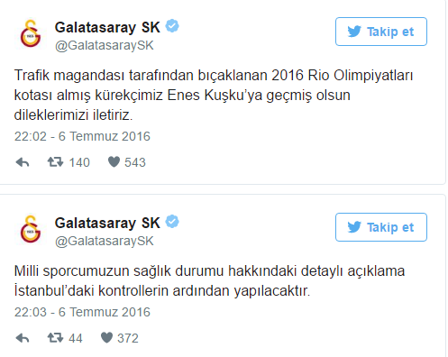 Bu arada Galatasaray Kulübünün sosyal medya hesabındaki paylaşımda, Enes Kuşku'nun durumuyla ilgili açıklamanın İstanbul'daki kontrollerden sonra yapılacağı belirtilerek, "Trafik magandası tarafından bıçaklanan 2016 Rio Olimpiyatları kotası almış kürekçimiz Enes Kuşku'ya geçmiş olsun dileklerimizi iletiriz. Milli sporcumuzun sağlık durumu hakkındaki detaylı açıklama İstanbul'daki kontrollerin ardından yapılacaktır." denildi.