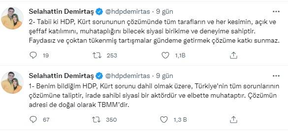 HDP Eş Genel Başkanı Selahattin Demirtaş sosyal medya üzerinden olmayan Kürt sorununun çözümü için HDP’nin muhatap alınmasına yönelik paylaşımda bulundu. Demirtaş yaptığı paylaşımda, “Benim bildiğim HDP, Kürt sorunu dahil olmak üzere, Türkiye’nin tüm sorunlarının çözümüne taliptir, irade sahibi siyasi bir aktördür ve elbette muhataptır. Çözümün adresi de doğal olarak TBMM’dir. Tabii ki HDP, Kürt sorununun çözümünde tüm tarafların ve her kesimin, açık ve şeffaf katılımını, muhataplığını bilecek siyasi birikime ve deneyime sahiptir. Faydasız ve çoktan tükenmiş tartışmalar gündeme getirmek çözüme katkı sunmaz." dedi.