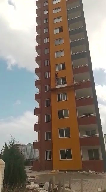 Adana’da 13 katlı bir binanın orta kısmında tadilat yapan işçi, iskelenin kayması sonucu taktığı güvenlik kemeri kurtardı.