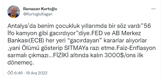 Sosyal medya hesabından bir paylaşımda bulunan Kurtoğlu, "Antalya’da benim çocukluk yıllarımda bir söz vardı. ”56 İfo kamyon gibi gıcırdıyor” diye. FED ve AB Merkez Bankası (ECB) her yeri “gacırdayan” kararlar alıyorlar. Yani ölümü gösterip sıtmaya razı etme. Faiz-Enflasyon sarmalı çıkmazı…Fiziki altında kalın 3000$/ons ilk dönemeç" dedi.