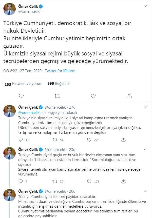 AK Parti Sözcüsü Ömer Çelik, Twitter hesabından yaptığı açıklamada, Türkiye Cumhuriyeti'nin demokratik, lâik ve sosyal bir hukuk devleti olduğunu bildirdi. Bu nitelikleriyle Cumhuriyetin herkesin ortak çatısı olduğunu kaydeden Çelik, "Ülkemizin siyasal rejimi büyük sosyal ve siyasal tecrübelerden geçmiş ve geleceğe yürümektedir. Türkiye’nin siyasal rejimiyle ilgili siyasal kamplaşma üretmek yanlıştır. Cumhuriyetimiz tüm nitelikleriyle gözbebeğimizdir. Dünden beri sosyal medyada siyasal rejimimizle ilgili ortaya çıkan sağlıksız tartışma ve kamplaşma, Türkiye’nin gündemi değildir" ifadelerini kullandı.