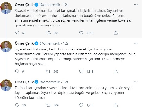 Çelik, Twitter hesabından yaptığı paylaşımda, siyaset ve diplomasinin tarihsel tartışmaları kışkırtmaması gerektiğine işaret ederek, "Siyaset ve diplomasi tarihsel tartışmaları kışkırtmamalıdır. Siyaset ve diplomasinin görevi tarihe ait tartışmaların bugünü ve geleceği rehin almasını engellemektir. Siyasetçiler kendilerini tarihçilerin yerine koyarsa, görevlerini yapmamış olurlar. Siyaset ve diplomasi, tarihi bugün ve gelecek için bir vizyona dönüştürmelidir.