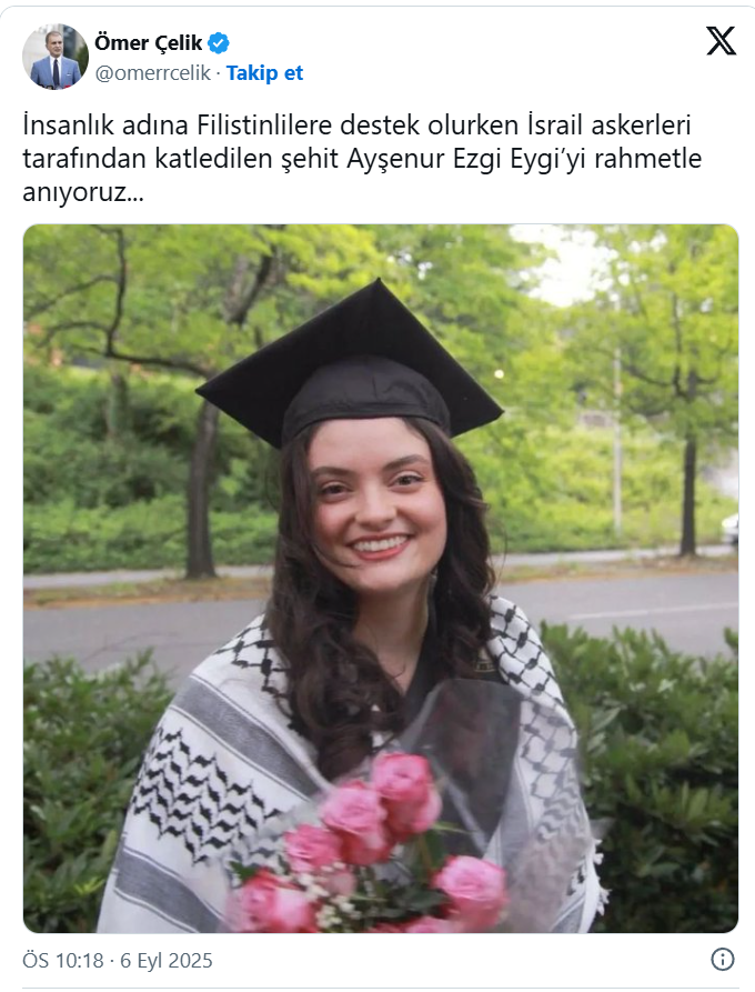 AK Parti Sözcüsü Ömer Çelik sosyal medya hesabında, 6 Eylül 2024'te İsrail tarafından katledilen Ayşenur Ezgi Eygi'nin vefatının yıl dönümünde paylaşımda bulundu.