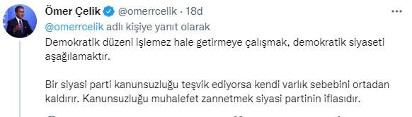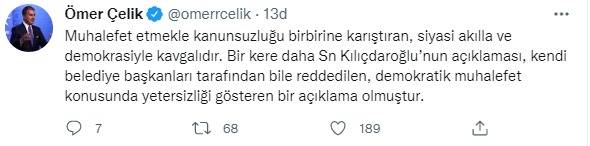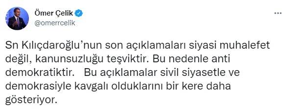 AK Parti Sözcüsü Ömer Çelik, sosyal medya hesabından yaptığı paylaşımda, "Kılıçdaroğlu'nun son açıklamaları siyasi muhalefet değil, kanunsuzluğu teşviktir. Bu nedenle anti demokratiktir. Bu açıklamalar sivil siyasetle ve demokrasiyle kavgalı olduklarını bir kere daha gösteriyor. Demokratik düzeni işlemez hale getirmeye çalışmak, demokratik siyaseti aşağılamaktır. Bir siyasi parti kanunsuzluğu teşvik ediyorsa kendi varlık sebebini ortadan kaldırır. Kanunsuzluğu muhalefet zannetmek siyasi partinin iflasıdır" dedi.