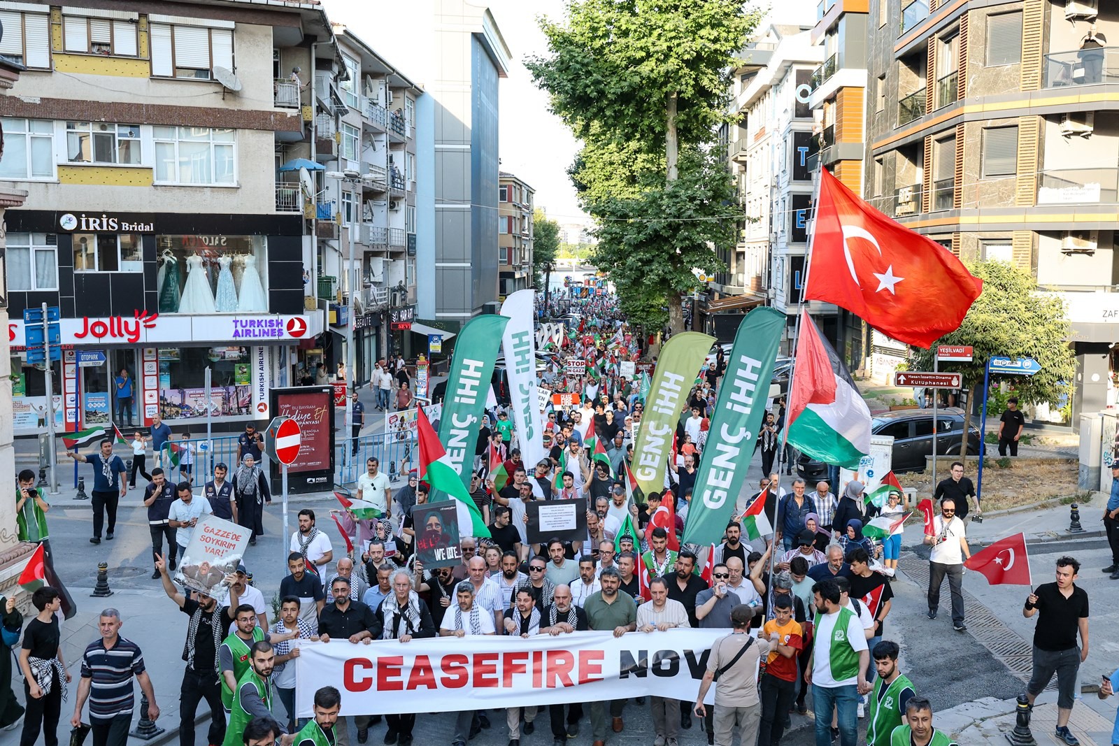 İHH İnsani Yardım Vakfı tarafından, işgalci İsrail’in Gazze’de 8 ayı aşkın süredir devam eden soykırımına karşı yürüyüş düzenlendi. Pendik Marmaray İstasyonu önünden başlayıp 100. Yıl Çocuk Parkı’nda sona eren yürüyüşe katılan on binlerce kişi, Filistin’e destek mesajı verdi.