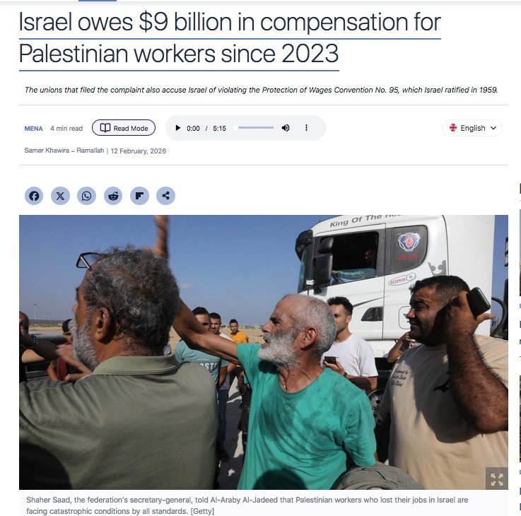 Uluslararası işçi örgütlerinin desteğini alan Filistin Genel Sendikalar Federasyonu, Ekim 2023’te Gazze’ye yönelik soykırım savaşının başlamasının ardından İsrail’de işlerini kaybeden yaklaşık 225.000 Filistinli işçi için İsrail’den 9 milyar dolar tazminat talep ediyor. Uluslararası Çalışma Örgütü’ne (ILO) bağlayıcı uluslararası anlaşmalar uyarınca ücret ve yasal haklara ilişkin bir dava açıldı. İsrail’in tazminat ödemeyeceğine giderek daha çok inanmasına rağmen, işgal altındaki Batı Yaka’nın kuzeyindeki Nablus’tan bir işçi olan İmran el-Saeed, federasyonun uluslararası sendikaların desteğiyle İsrailli işverenlerden mali tazminat talep ettiği on binlerce Filistinli işçinin bulunduğu listeye adının eklenmesini kabul etti.