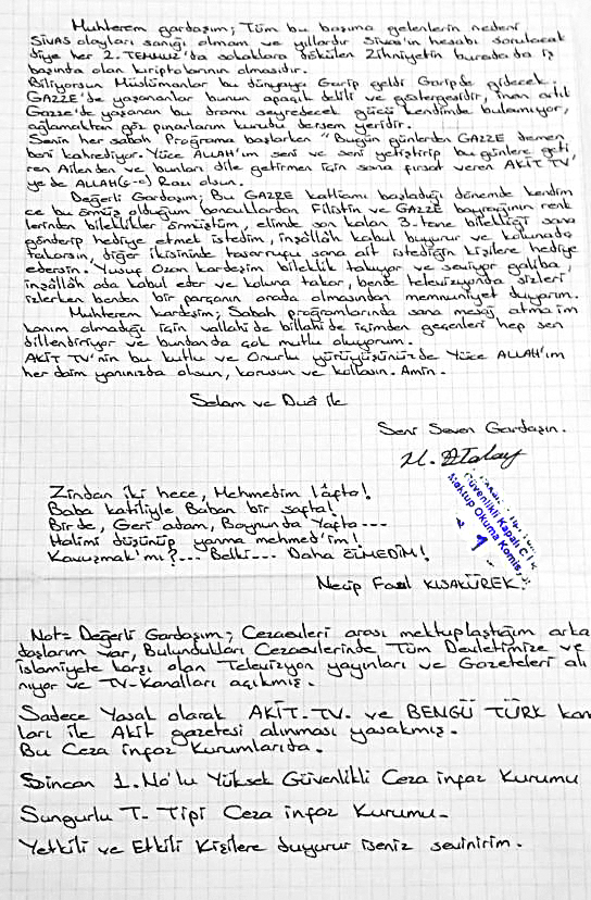 Atalay, cezaevinden Akit’e gönderdiği ikinci mektubunda, 10 aydır yasağın devam ettiğini, bu yasak sebebiyle aylardır bir kazancının olmadığını ve dişlerini yaptıramadığını belirtti.