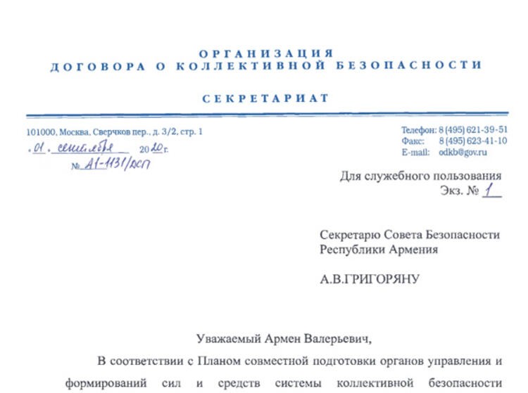 Ermenistan'ın eski lideri Serj Sarkisyan'ın damadı Mikayel Minasyan tarafından sızdırılan belge, 1 Eylül tarihli ve Kolektif Güvenlik Antlaşması Örgütü (CSTO) tatbikatı sırasında gönderilmiş.