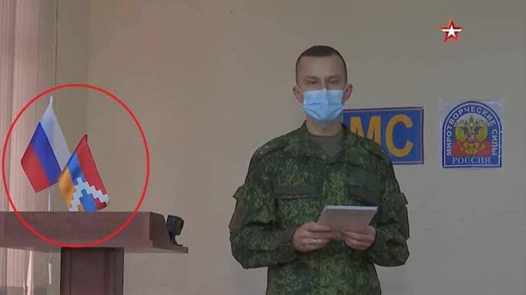Dağlık Karabağ'ın başkenti Hankendi'ye yerleşen Rus barış güçlerinin sözcüsü ise, basın toplantısında Rusya bayrağının yanında ilk kez işgalcilerin bayrağına yer verdi.